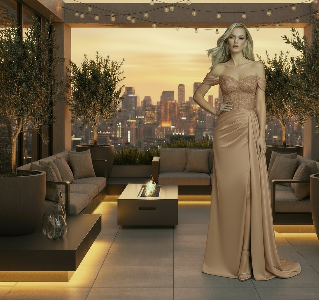 Beige (Champagne): Gold or pearl jewelry complements the neutral tone beautifully. Nude, gold, or champagne heels complete the look. Elegant updo or soft waves create timeless sophistication.