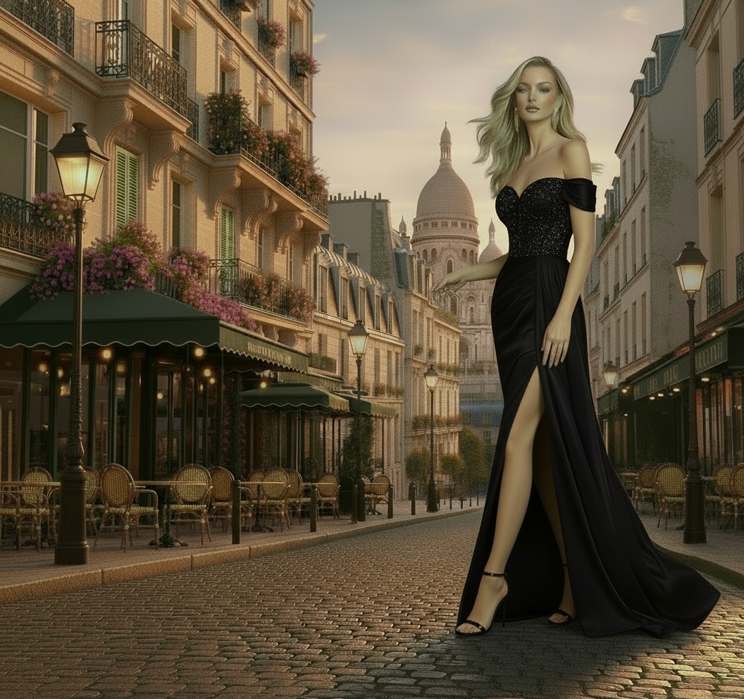Classic Black: Add statement jewelry in silver, gold, or diamonds. Black, nude, or metallic heels complete the look. Sleek straight hair or a sophisticated updo creates timeless elegance. The ultimate little black dress elevated to gown status.